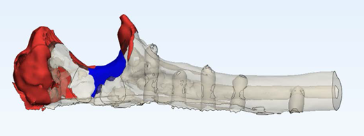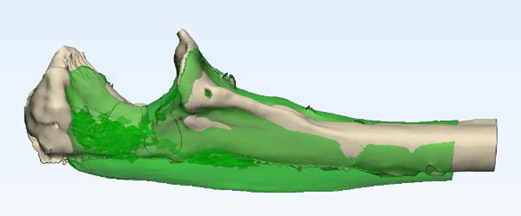 Para asegurar la solución óptima se decide realizar también un TAC del brazo sano, invertir la imagen como si se tratase de un reflejo de un espejo y superponer las dos tomografías. De esta manera, se puede comparar el codo patológico con el sano.
